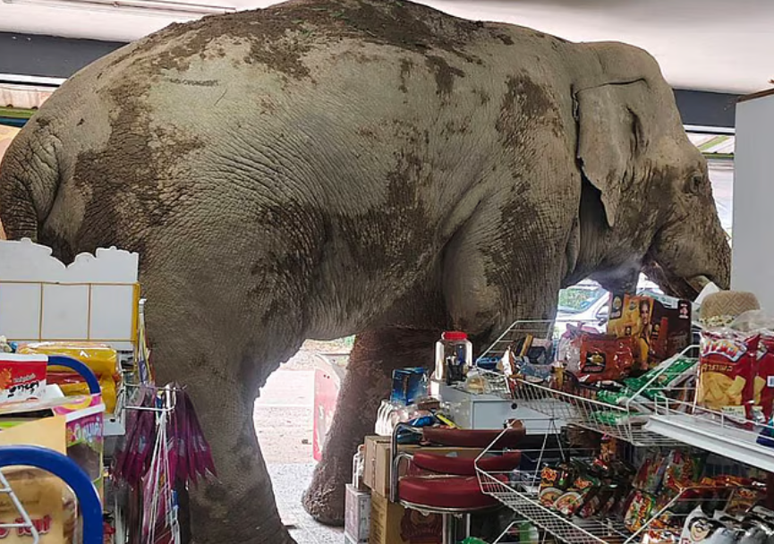 সোমবার থাইল্যান্ডের একটি মুদি দোকানে একটি ক্ষুধার্ত বন্য হাতি তাণ্ডব চালায় যখন সে কাছের একটি জাতীয় উদ্যান থেকে হেঁটে এসে তাকে খাবার রাখতে সাহায্য করে।